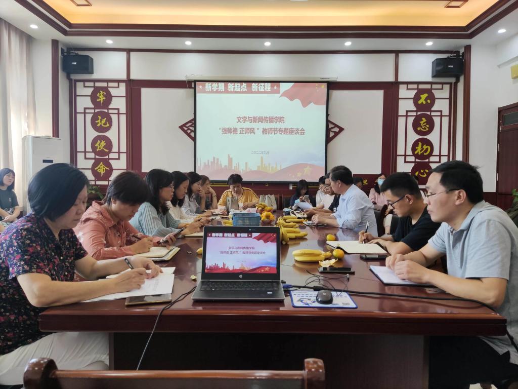 在第38个教师节来临之际,文学与新闻传播学院在博文楼329会议室召开了“强师德 正师风”教师节专题座谈会,围绕如何进一步加强师德师风建设进行了座谈。文学与新闻传播学院领导班子成员、全体教师参加了本次座谈会。