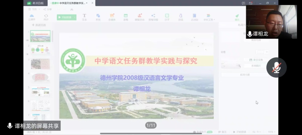 5月11日是德州学院建校51周年校庆日。文学与新闻传播学院邀请2012届汉语言文学本科班校友谭相龙为2022届应届毕业生做线上讲座。谭相龙现就职于潍坊昌邑市第一中学,中学一级教师,从教十年来,多次获得昌邑市优秀班主任、十佳班主任、创新型班主任荣誉称号;获得潍坊市教学成果二等奖。此次讲座,谭相龙以《中学语文任务群教学实践与探究》为题,为即将毕业的2022届汉语言文学专业学生带来了一场精彩的报告,帮助即将走上中学语文教师岗位的同学们了解教师岗位要求,建立职业自觉、创新工作方式方法、启发教科研兴趣。此次报告会得到了文学院师生的一致认可和广泛好评。