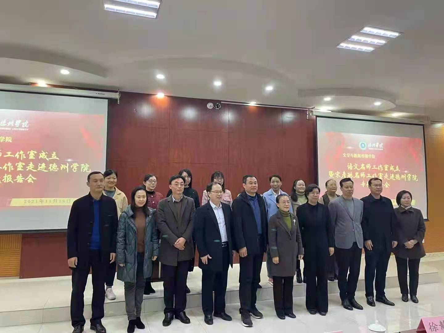 2021年11月19日上午,文学与新闻传播学院在博文楼三楼报告厅举行语文名师工作室揭牌仪式暨宋彦琳名师工作室走进德州学院专场报告会。校党委委员、副校长徐静、德州市第九中学宋彦琳名师工作室成员、文学院党政负责人及文学院汉语言文学专业部分师生参加了此次揭牌仪式,并听取了报告会。徐静副校长在名师工作室揭牌仪式上致辞。她指出:文学与新闻传播学院打造语文名师工作室平台,是适应高等教育改革和校城融合发展的时代要求打造一体化教师教育联盟,强化校地教科研合作,搭建高层次语文名师交流平台,促进语文教师专业发展,改进和创新汉语言文学专业人才培养的重要举措。徐校长对语文名师工作室的成立寄予厚望,希望语文名师工作室能够落实“立德树人”的根本任务,凝聚校内外的名师资源,促进教师专业发展,成为汉语言文学专业学生职前培养和职后指导一体化的“高平台”、语文骨干教师的“孵化器”,新时代德州市语文教育守正创新的“助推器”。