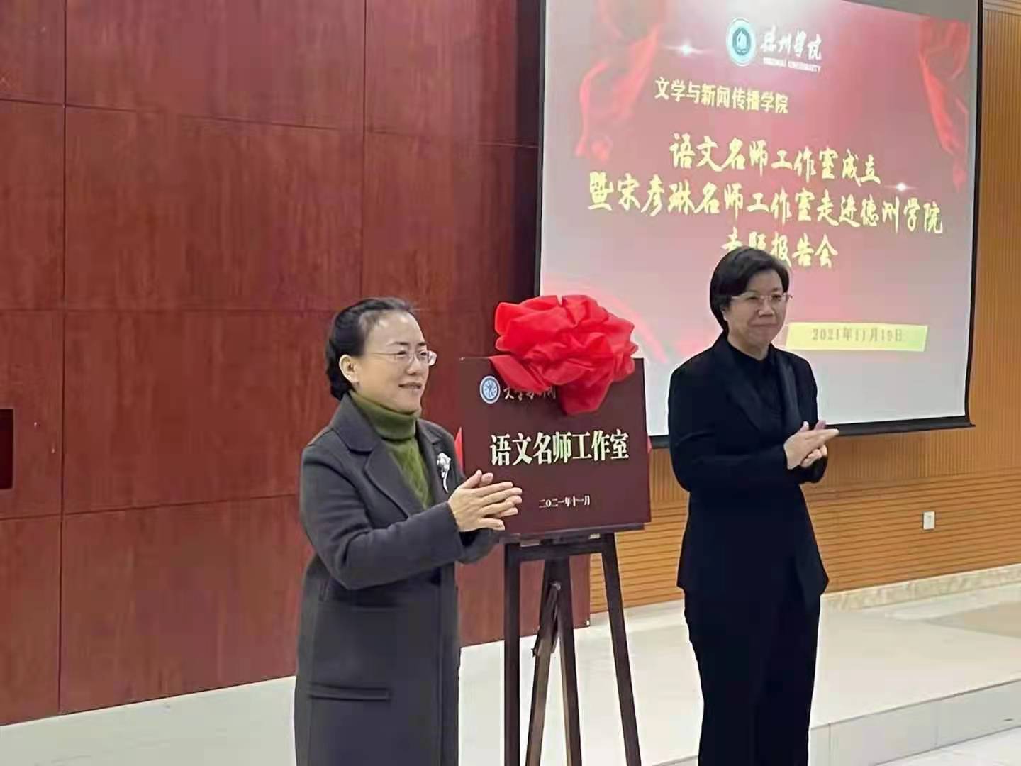 随后,徐静副校长与德州市第九中学宋彦琳校长共同为文学与新闻传播学院语文名师工作室揭牌。宋彦琳名师工作室为在场师生带来了精彩的语文课评课和专家报告。