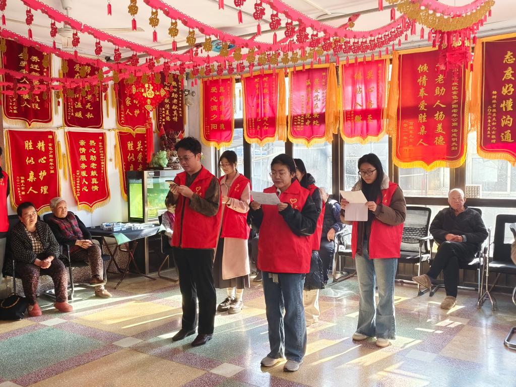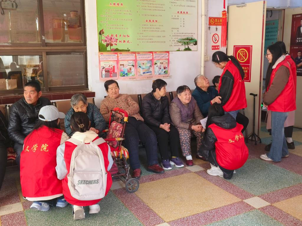 活动以诗歌《这是一首最美的抒情诗》朗诵拉开序幕,学生用抑扬顿挫的声线演绎岁月沉淀的诗意。随后的经典民歌联唱环节,《花桥流水》《东方红》等旋律引发全场共鸣,多位老人随节拍轻声应和。学院特别设计的"文史养生课"将健康知识与生活日常结合,讲解春季膳食搭配时融入老人们平时的饮食习惯,让老人们在会心一笑中掌握养生技巧。互动环节中,00后志愿者与耄耋长者展开"跨世纪对话"。志愿者们围坐在老人们身边,关切地询问老人们的身体状况,仔细聆听他们的生活需求,并饶有兴致地与老人们下起了象棋。现场气氛轻松愉快,欢声笑语此起彼伏,志愿者与老人们其乐融融,宛如一家人。