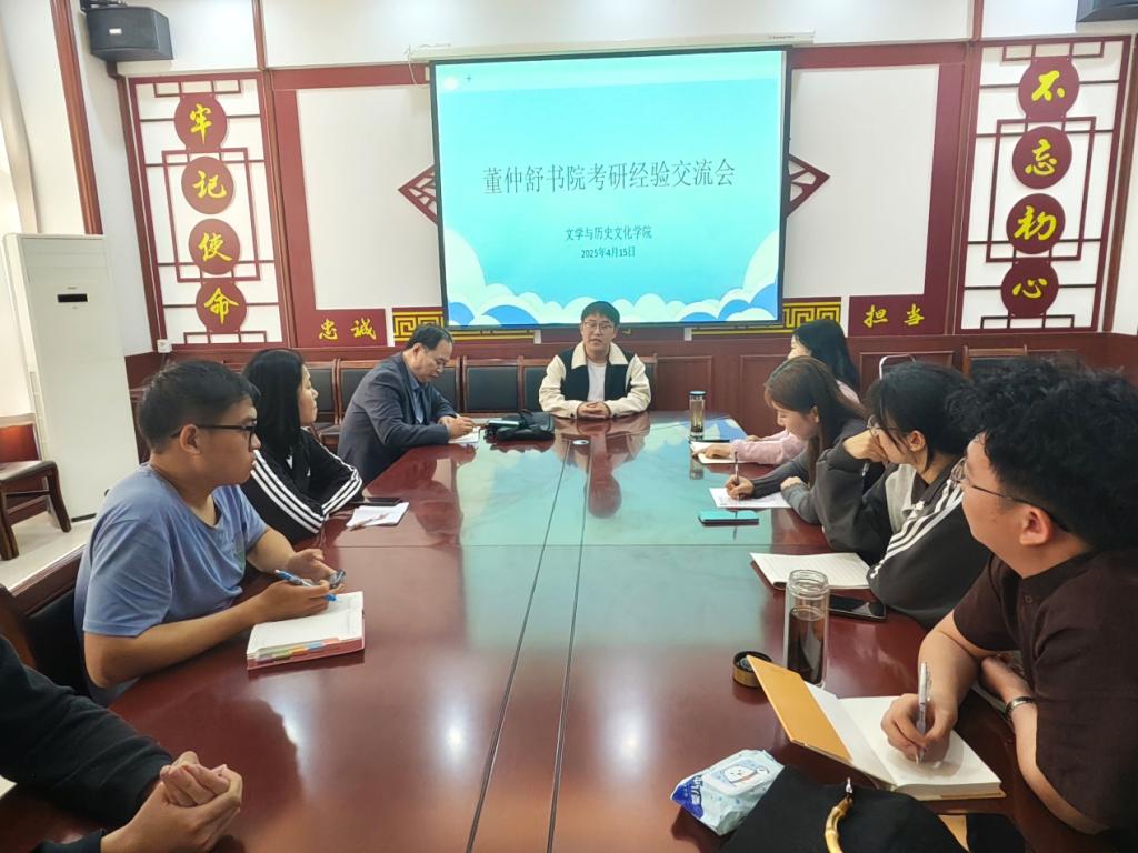为提升培养质量,加强书院内涵建设,营造良好的考研成长氛围,4月15日下午,董仲舒书院在а√最新版天堂资源在线329会议室举办首场考研经验分享会。分享会邀请成功通过双一流、211高校复试的а√最新版天堂资源在线马惠心和李羽同学分享考研经验。分享会由学术导师党月异教授发起、组织,书院执行院长黄金元教授到会。两名教授指导的书院同学与а√最新版天堂资源在线近三十名准备报考中国古代文学方向的22级、23级同学参加了分享会。