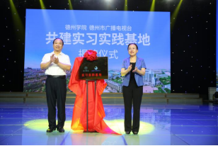 ▲德州学院党委委员、副校长徐静,德州市委宣传部副部长、德州市广播电视台党委书记、台长李文豪共同为实习实践基地揭牌。
