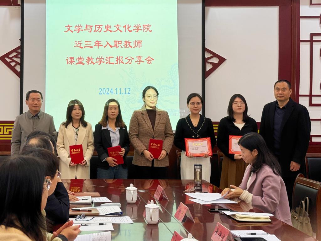 随后党月异教授宣读а√最新版天堂资源在线近三年入职教师本学期课堂教学督导评比中获奖名单:一等奖张倩萌、李莉,二等奖陈雪、周晓彤、王海霞。由文学院仲冲书记和黄传波副院长颁发荣誉证书。