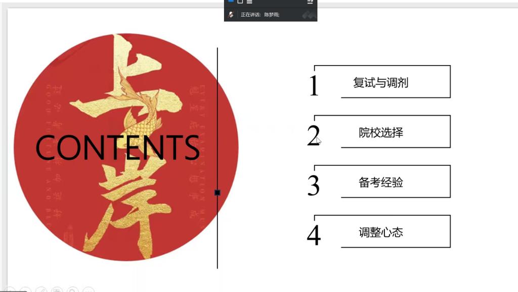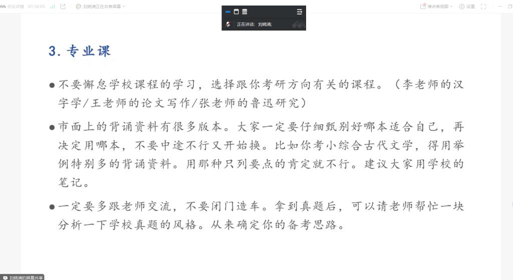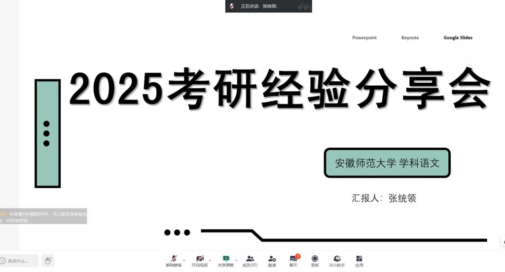 本次分享会邀请了4位2020届优秀毕业生进行经验分享,详细介绍了考研复试流程、英语口语、综合面试、复试调剂等方面的注意事项。考入西安外国语大学的赵梦蝶虽有事不能现场分享,但准备了逐字稿由主持人马超老师进行转述。她着重分享了考研择校和复试准备的方法,包括如何撰写复试简历、如何整理个人材料等,告诉大家考研过程中要“允许一切都发生”,学会及时调整心态,才能走得更稳。考入安徽师范大学的张统领结合自身经历,重点强调了复试模拟的重要性,建议在复试前进行不少于五次的模拟面试,以帮助自己适应高压环境,达到最好状态。考入牡丹江师范学院的陈梦雨提醒同学们要积极拓宽信息渠道,密切关注考研复试及调剂动态,就考研复试备考策略、心态调整等方面提出了具体建议。考入聊城大学的刘晓清详细介绍了考研择校的和复试专业课的方法,并建议现场同学不要懈怠学校课程的学习,复试专业课可以多跟老师们交流真题思路等。