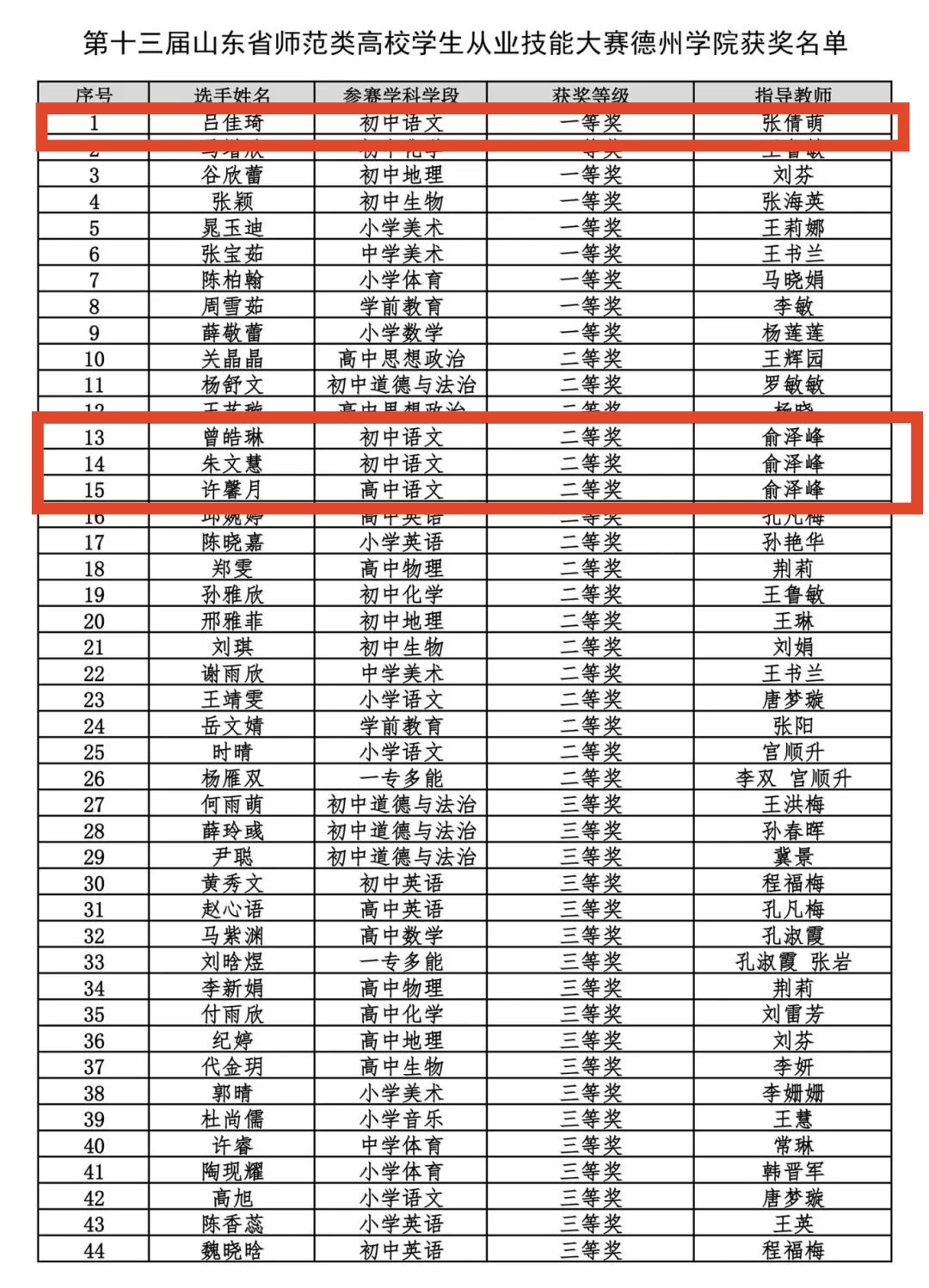我院选手凭借扎实的专业功底和教学智慧,展现了出色的课堂驾驭能力。其中,初中语文组吕佳琦以扎实功底和出色表现荣获一等奖第一名,朱文慧、曾皓琳荣获二等奖,高中语文组许馨月荣获二等奖。选手们从容自信的教态、将知识讲解与素养培育巧妙融合的教学设计,充分彰显了学院学生的综合能力。