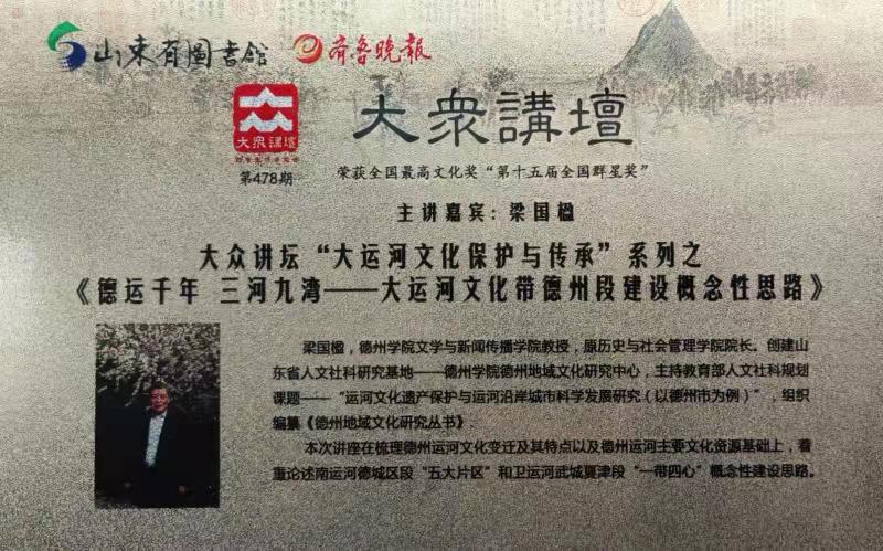 “大众讲坛”约请文学与新闻传播学院梁国楹教授主讲德州运河文化